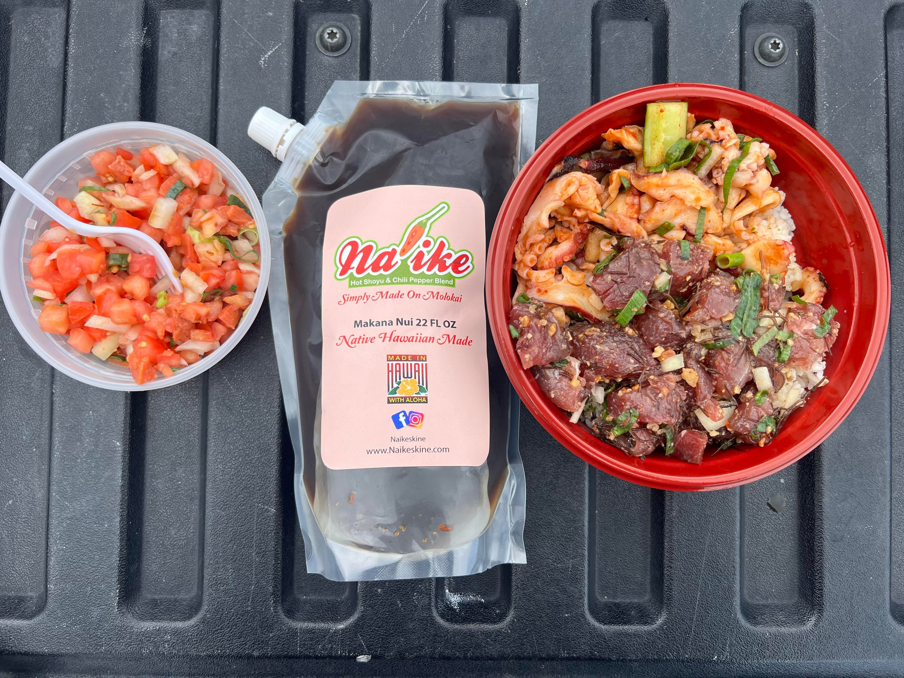 A combination of husband and wife team Nani and Mike's first name, Naʻike's Kine has been blending up tasteful food products on Molokai since 2002 with their most popular and shelf ready Na'ike Shoyu Chili Pepper Sauce.